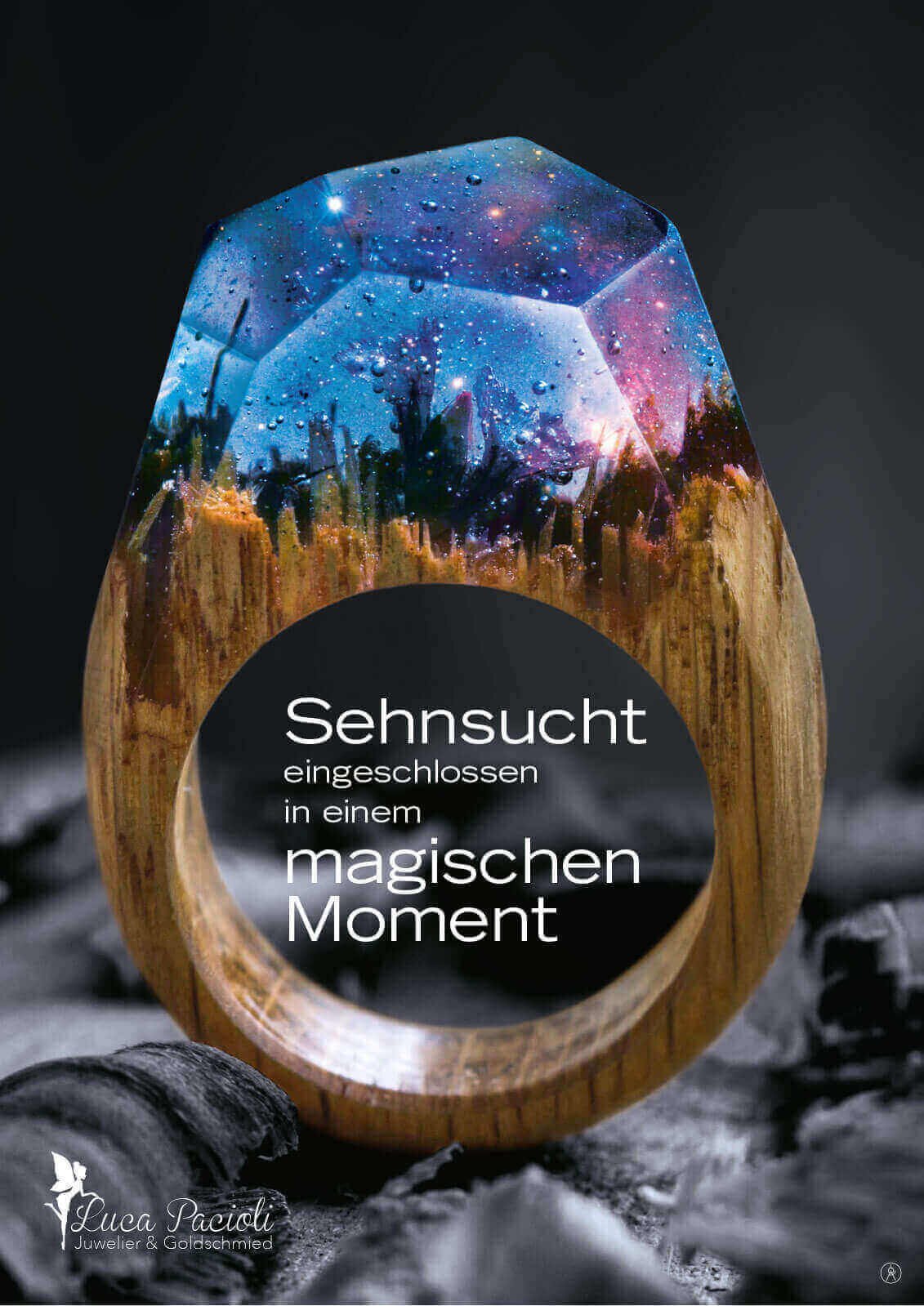Ansätze: Bodenständigkeit symbolisiert durch Holz in Kombination mit Harzeinschlüssen, die an den Sternenhimmel erinnern. Diesen Ring gibt es wirklich! Das unwirkliche Ambiente sind schlicht gefärbte Holzspäne. Hätten Sie es erraten? Schmuck wird gerne als nachhaltiger und wertbeständiger Werkstoff und Symbol für Erinnerungen genutzt. Wann hatten Sie einen magischen Moment in Ihrem Leben? Als Alchemist weiß ein Magier Rohstoffen einen neuen Nutzen zu geben. Wissenschaftliches Wissen hilft beim Einsatz von Magie, z.B. im Nutzen von Aggregatzuständen oder neuester Technik. Disney nutzt die 3D-Animation um Dinge sichtbar zu machen, die wir uns vorher nicht vorstellen konnten. Ein Magier schafft Lebenswendungen und Transformation zum Guten, replizierbar. Aber Vorsicht, ein Schausteller mit technisch ausgeklügeltem Zubehör (Hut/Kaninchen) ist noch kein Magier, er ist Narr und erfreut die Menschen.