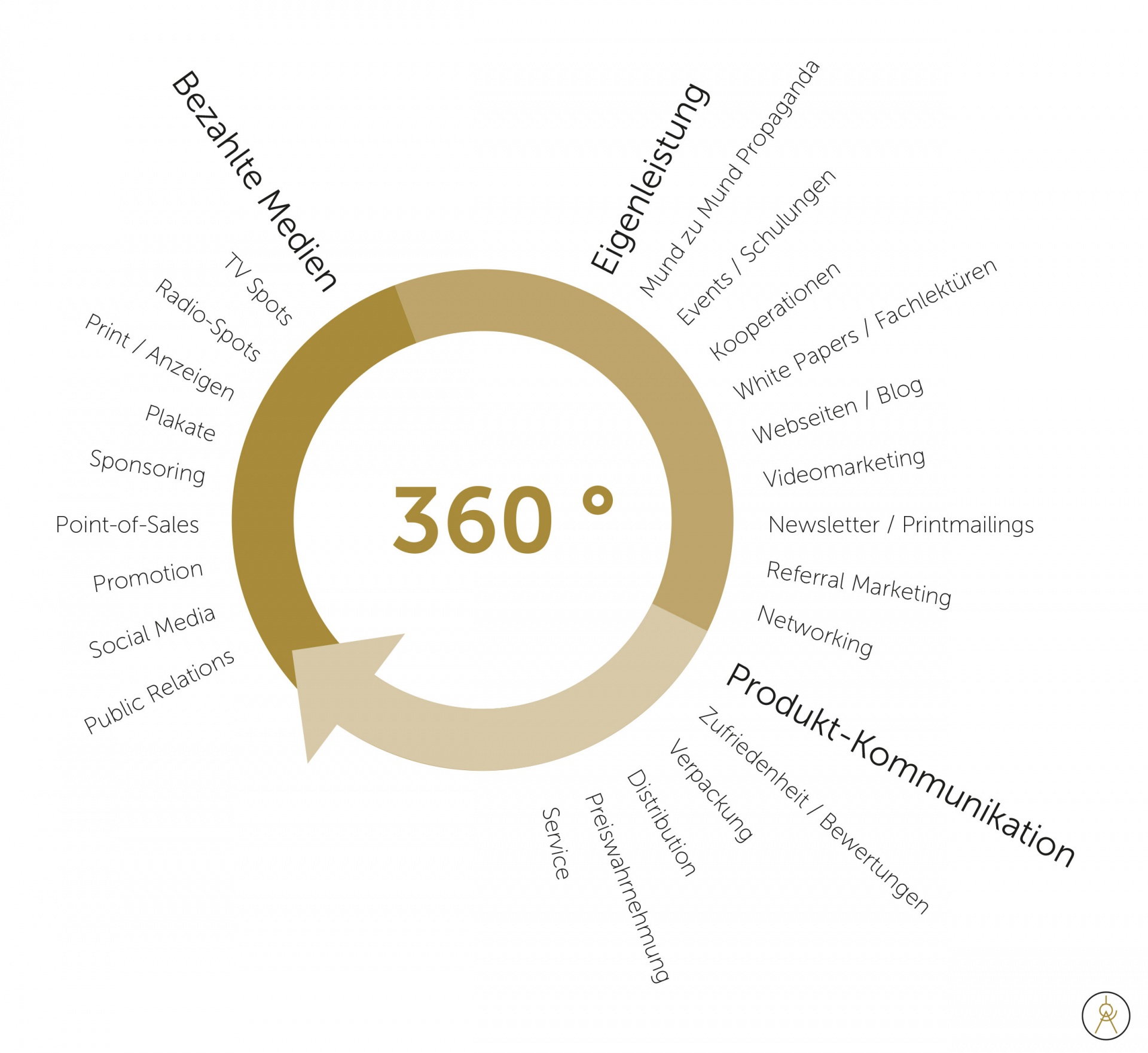 Unsere 360-Grad-Kommunikationsstrategien berücksichtigt bezahlte Medien genauso wie die Mund-Propaganda, eigene Medien, Analog und Digital. Man verbindet die Zielgruppe mit dem Produkt oder der Leistung mit der bestmöglichen Reputation.
